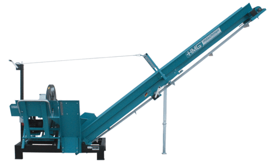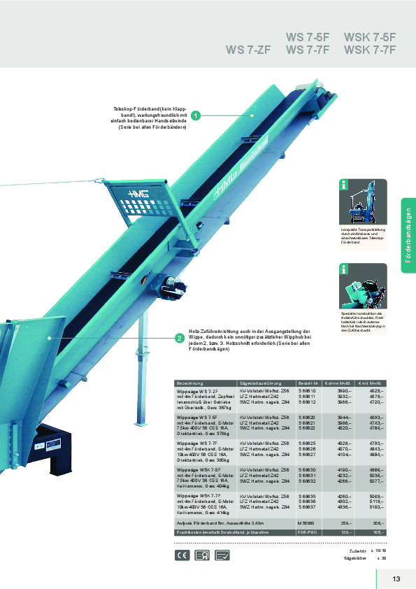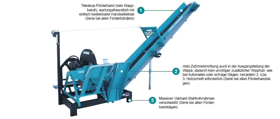 Schneiden mit Höchstleistung! Diesen Anspruch werden alle HMG-Kreissägen gerecht und mit der HMG-Wippkreissäge -WS 7-5F, WS 7-7F, WSK 7-5F, WSK 7-7F- geht das Arbeiten noch viel schneller. Das 4 m lange Teleskop-Förderband läßt sich mechanisch einfach und schnell von Transport- in Arbeitsstellung bringen. Ein besonderer Vorteil liegt in der Konstruktion des Holzzuführschachtes am Förderband. Denn das Restholzstück eines jeden verarbeitenden Meterholzes rutscht automatisch bei Nachbestückung in den Zuführschacht, ein unnötiger zusätzlicher Wipphub ist nicht erforderlich! Die Kreissäge ist mit einem robusten E-Motor ausgestattet. Zusätzlich wird der Motor durch einen Motorschutzschalter vor Schäden geschützt. Das Förderband wird über ein robustes Getriebe mit einem E-Motor angetrieben.