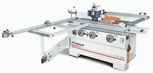 Kombinierte Säge-Fräsmaschine in Profi-Ausführung mit schwenkbarem Sägeblatt, schwenkbarer Frässpindel und Format-Schiebeschlitten.